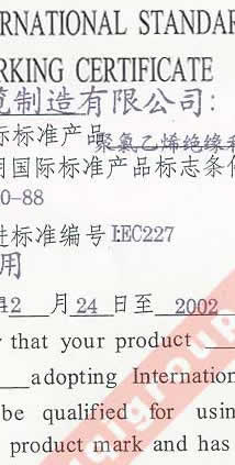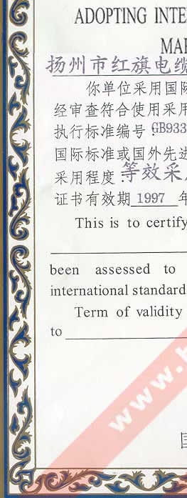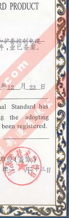 國家技術(shù)監(jiān)督局采用國際標(biāo)準(zhǔn)證書(聚氯乙烯絕緣和護套控制電纜)