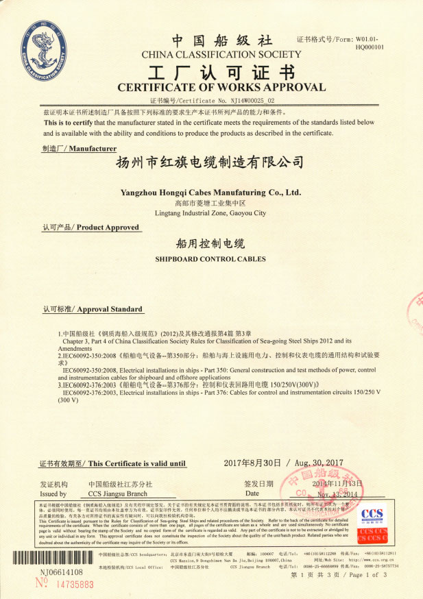 中國船級社工廠認(rèn)可證書(船用控制j電纜)