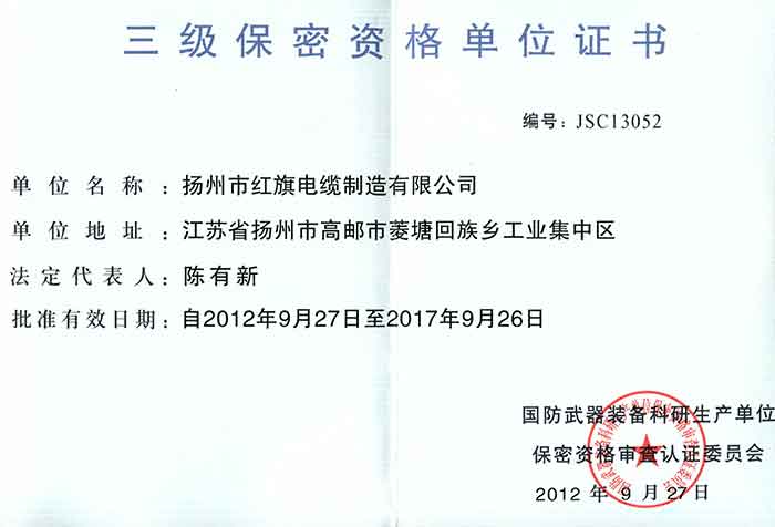 國(guó)防武器裝備科研生產(chǎn)三級(jí)保密資格單位證書