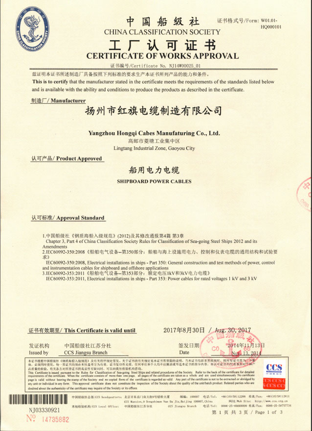中國船級社工廠認(rèn)可證書(船用電力電纜)