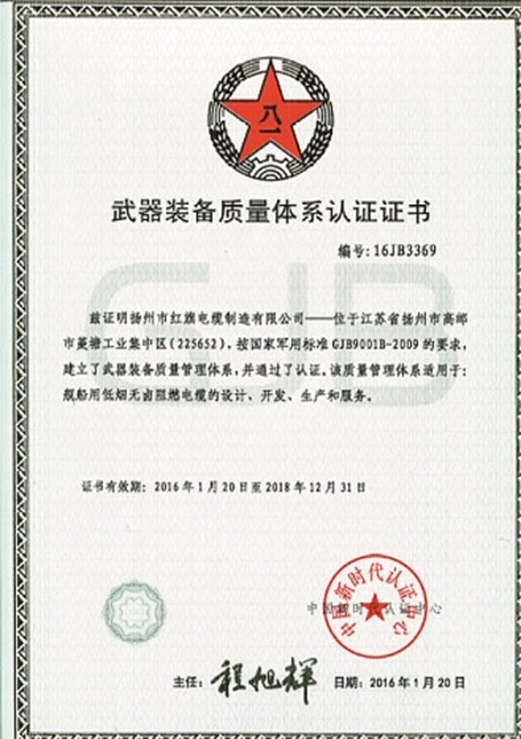 熱烈祝賀揚州紅旗電纜公司取得武器裝備質(zhì)量體系認證證書